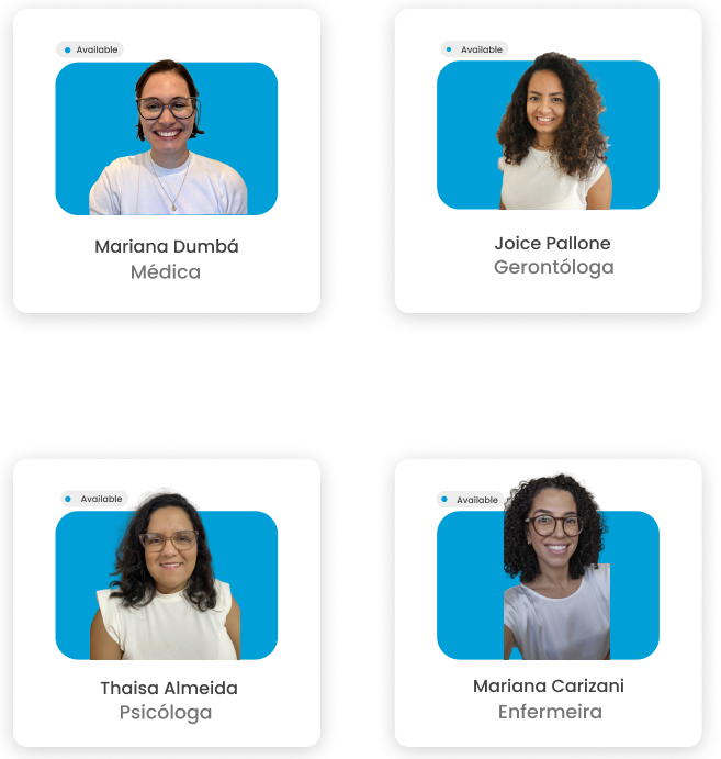 Médico virtual, psicólogo online, gerontologista, enfermeiro e diversos outros profissionais da saúde disponíveis para sua equipe em tempo integral.